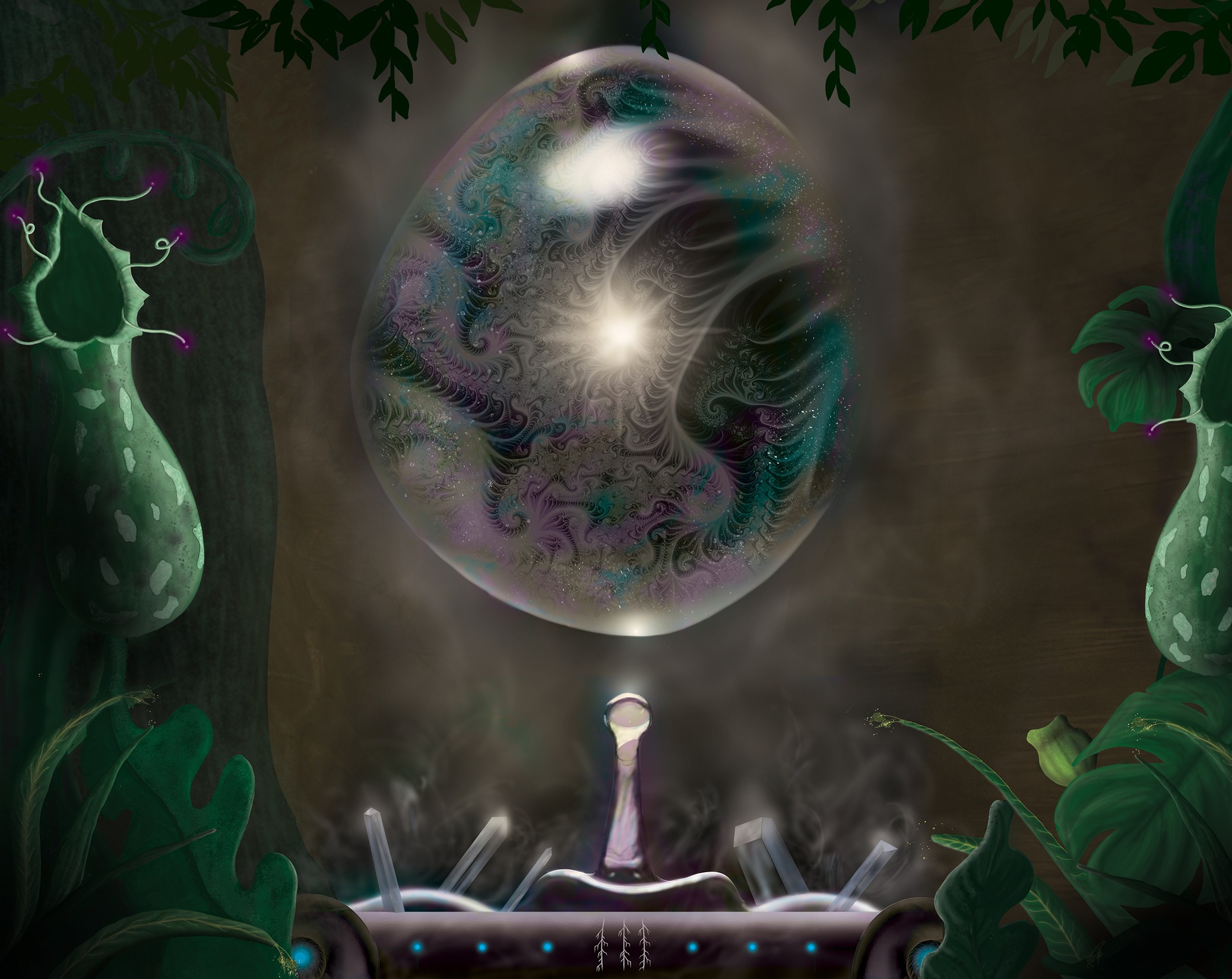 An image appears before you: a watery, bluish projection of . . . what seems to be a collection of rolling eyes. Eyes and tentacles and fractal flowers shifting in endless pursuit. And you feel a sense of presence. You’re no longer alone. Something huge and inhuman has turned its attention to you. And it is listening.