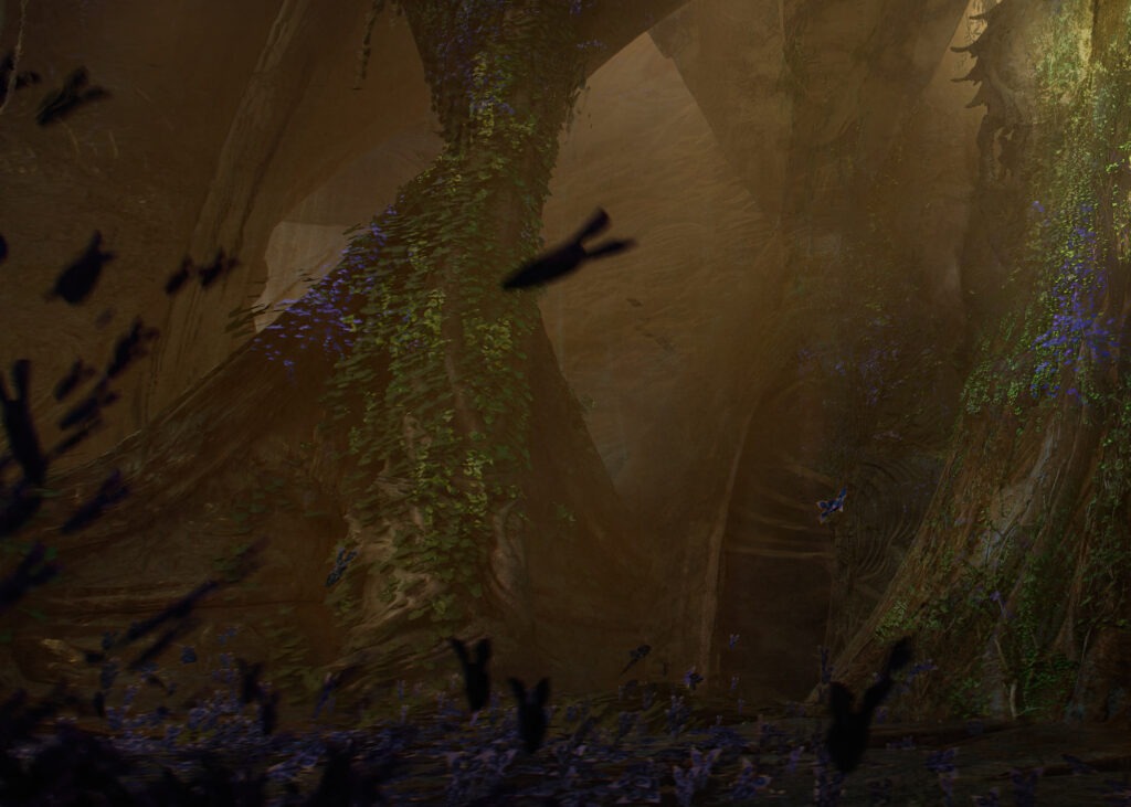 As you approach the unfinished section, the walls grow . . . messier, for the lack of a better term. The vines and trunks and other living elements that make up Unity’s bulk are wilder, more undisciplined here. Gaps show between trunks to the structural spars underneath. Vines cover the deck, and flat patches of metal and stone are visible in random sections of the walls and ceiling. It feels as if you’re entering the outskirts of a jungle—a space jungle—and you step carefully, for it seems as if there could things living here that are more dangerous than men with blasters.