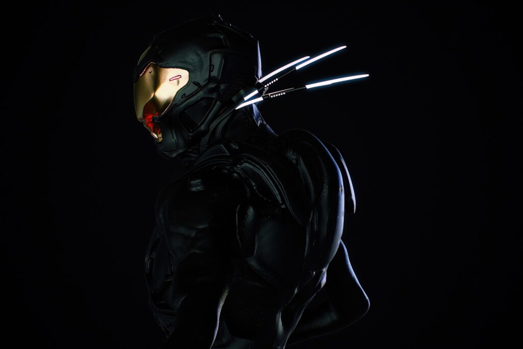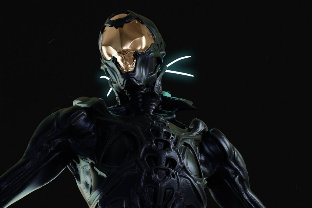 For the first time, you get a clear look at the person. Person or creature. You’re not sure. The being is about two meters tall, with broad, angular shoulders; a deep chest; and a wasp waist narrower than seems natural for a human. They’re wearing a black, skinsuit-like outfit, complete with a gold-mirrored helmet. No weapons are visible in their long, paddle-shaped hands or mounted on their suit—a minor relief that.