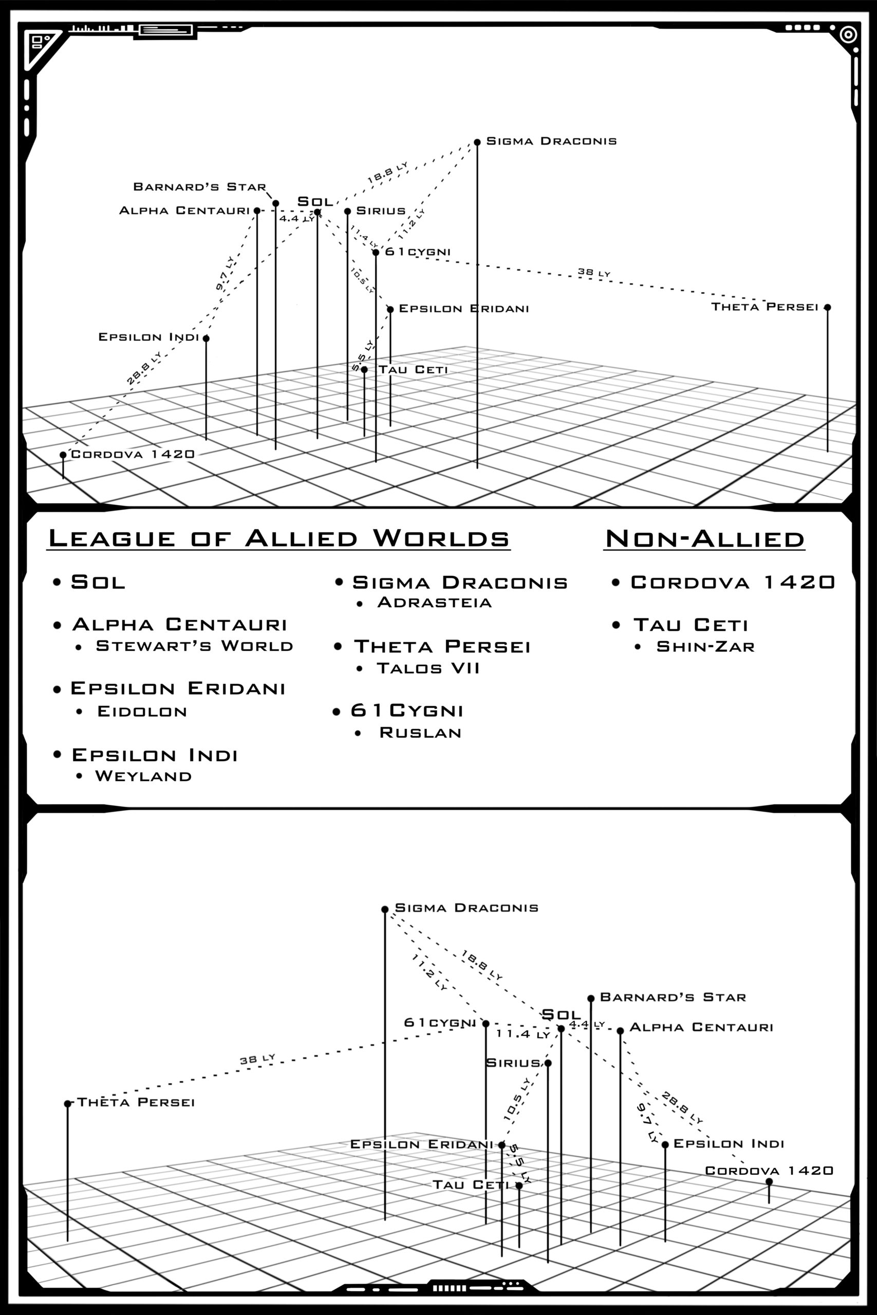 The interstellar government formed after the discovery of the Great Beacon on Talos VII; the knowledge that there was another space-faring species in the galaxy drove the push to unite humanity under a common banner. Some colonies and outposts—most notably Shin-Zar—resisted joining out of a desire to keep their independence. When it was formed in the 2230s, the League consisted of settlements in and around Sol, Alpha Centauri, Epsilon Indi, Epsilon Eridani, and 61 Cygni.