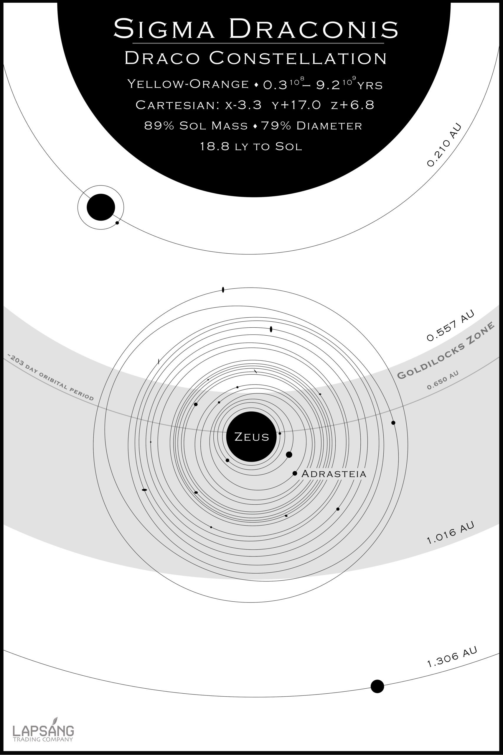 Two stars formed the core of this system, which was the destination of the UMC Valkyrie when Kira left Adrasteia in the Sigma Draconis system.